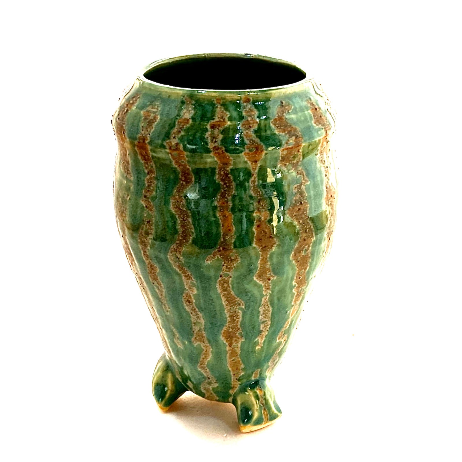 A large three footed green vase